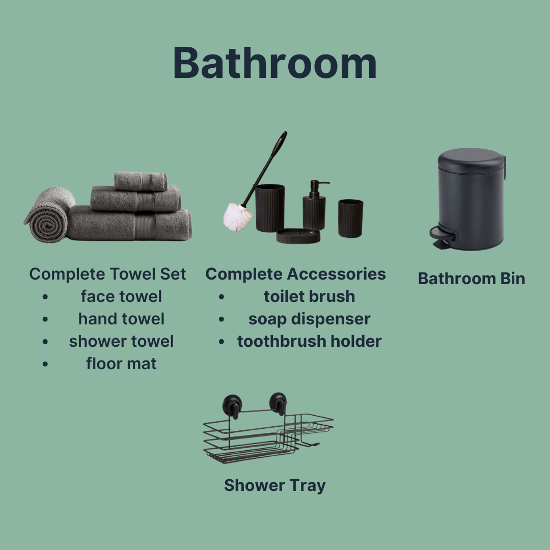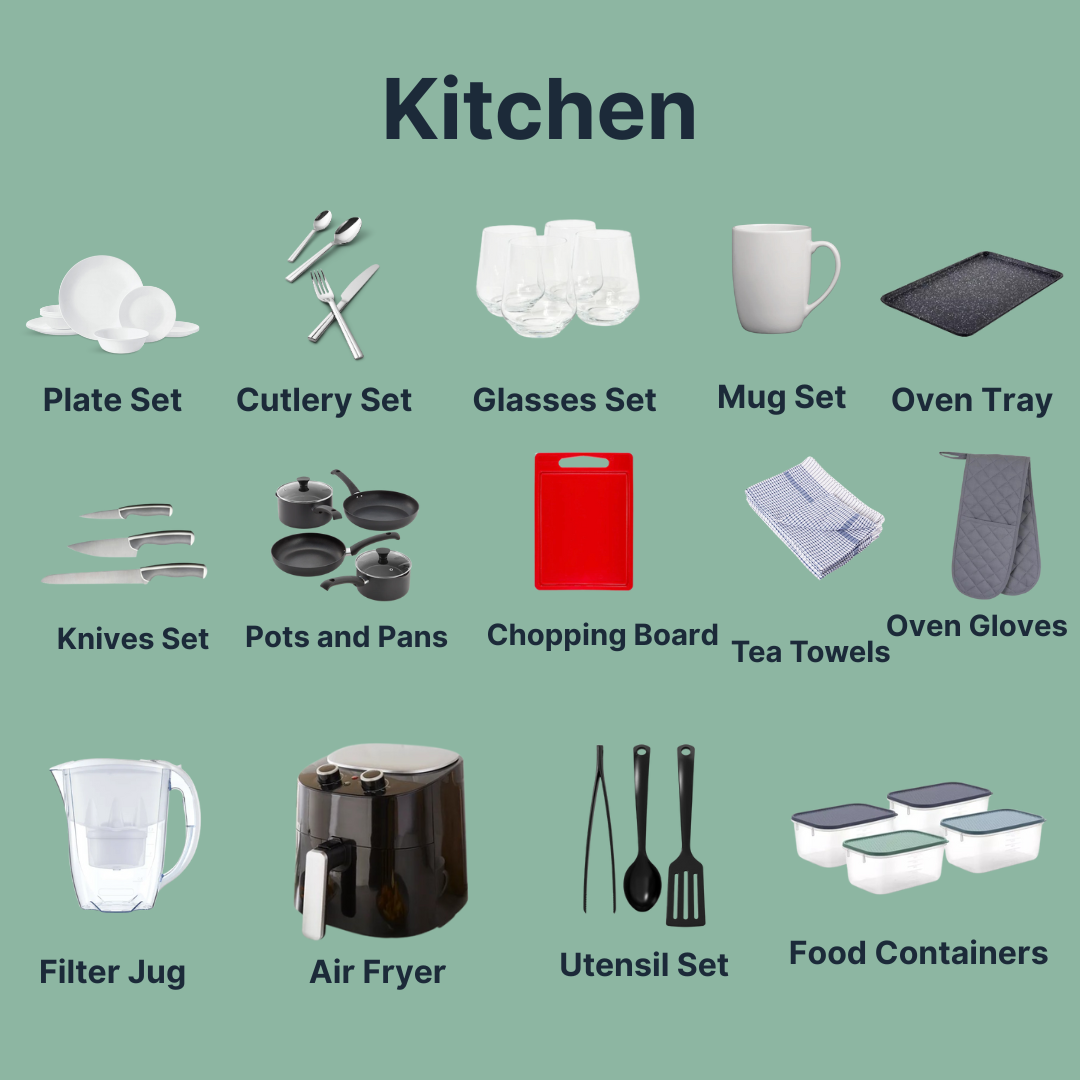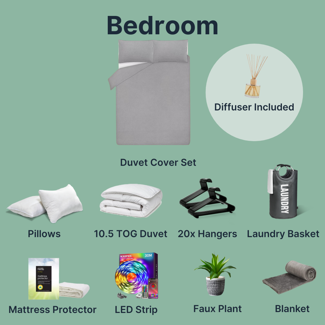 Each box contains core essentials like a duvet, pillows, fitted sheet, towels, hangers, cookware, plates, cutlery, a toothbrush holder, and more.